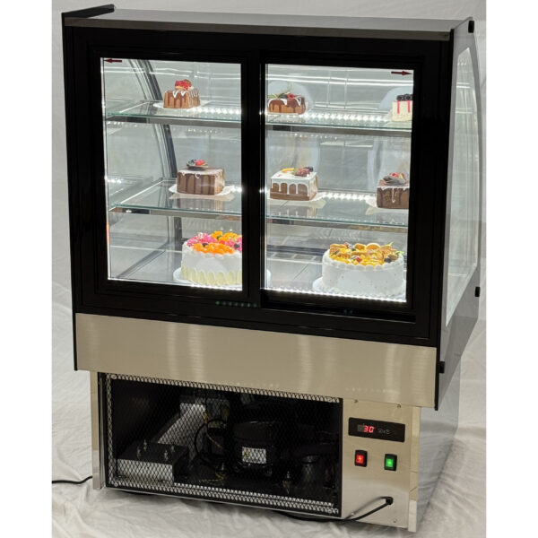 Original price was: 2064,13 €.846,30 €Current price is: 846,30 €. (ei sis. KM)Komerciālais kūku stends ar noapaļotu priekšpusi, 2 plaukti, 1000x700x1200mm, nerūsējošais tērauds un melns | Adexa HL1000EM2