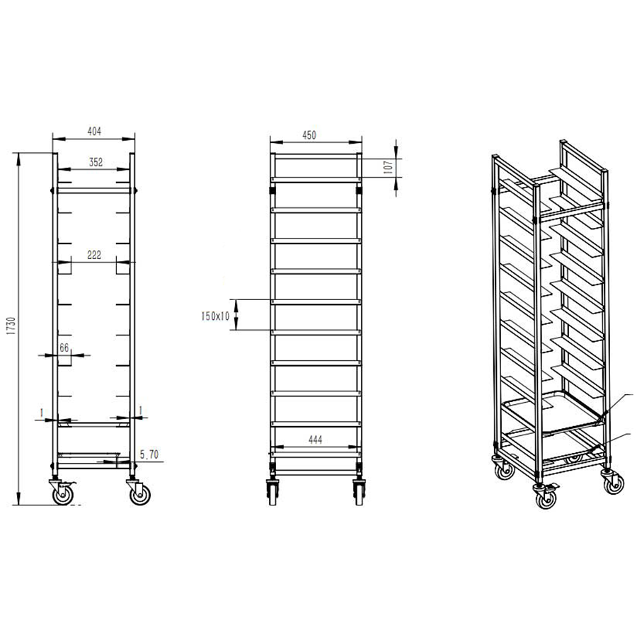 Original price was: 264,28 €.126,86 €Current price is: 126,86 €. (ei sis. KM) Šie augstas kvalitātes profesionālie plauktu ratiņi ir ideāli piemēroti lielu skaitu plāšu vai pannu sakraušanai un glabāšanai. Ratiņi ar 10 līmeņiem ir uzmontēti uz četriem ritenīšiem, lai nodrošinātu vieglu pārvietošanu jūsu restorānā, maiznīcā vai līdzīgā sabiedriskās ēdināšanas uzņēmumā. Plašāka informācija atrodama sadaļā “Specifikācija”. Ir noliktavā