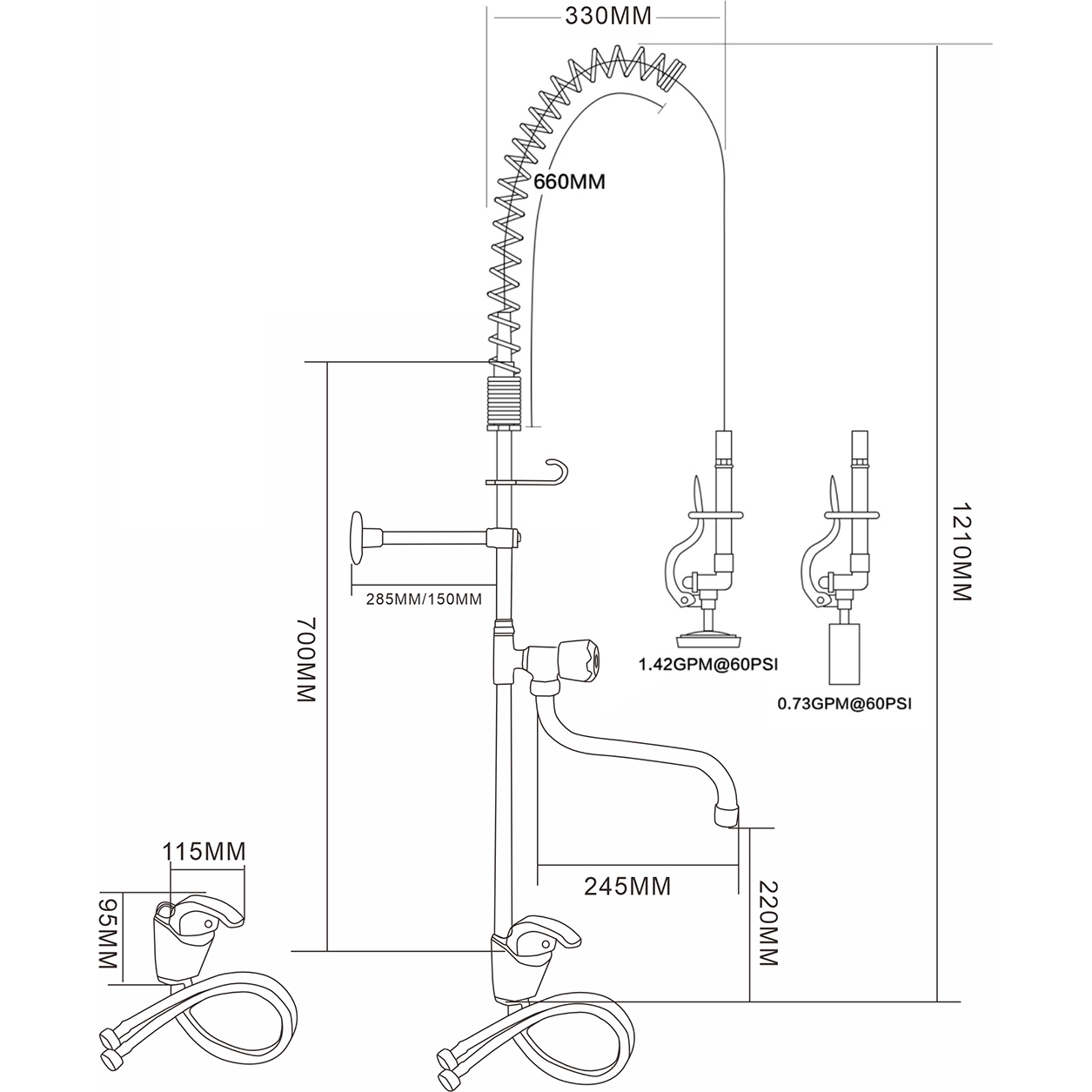 Pastāvīgs: 700mm / Šļūtene: 660mm / Atsperis: 330mm