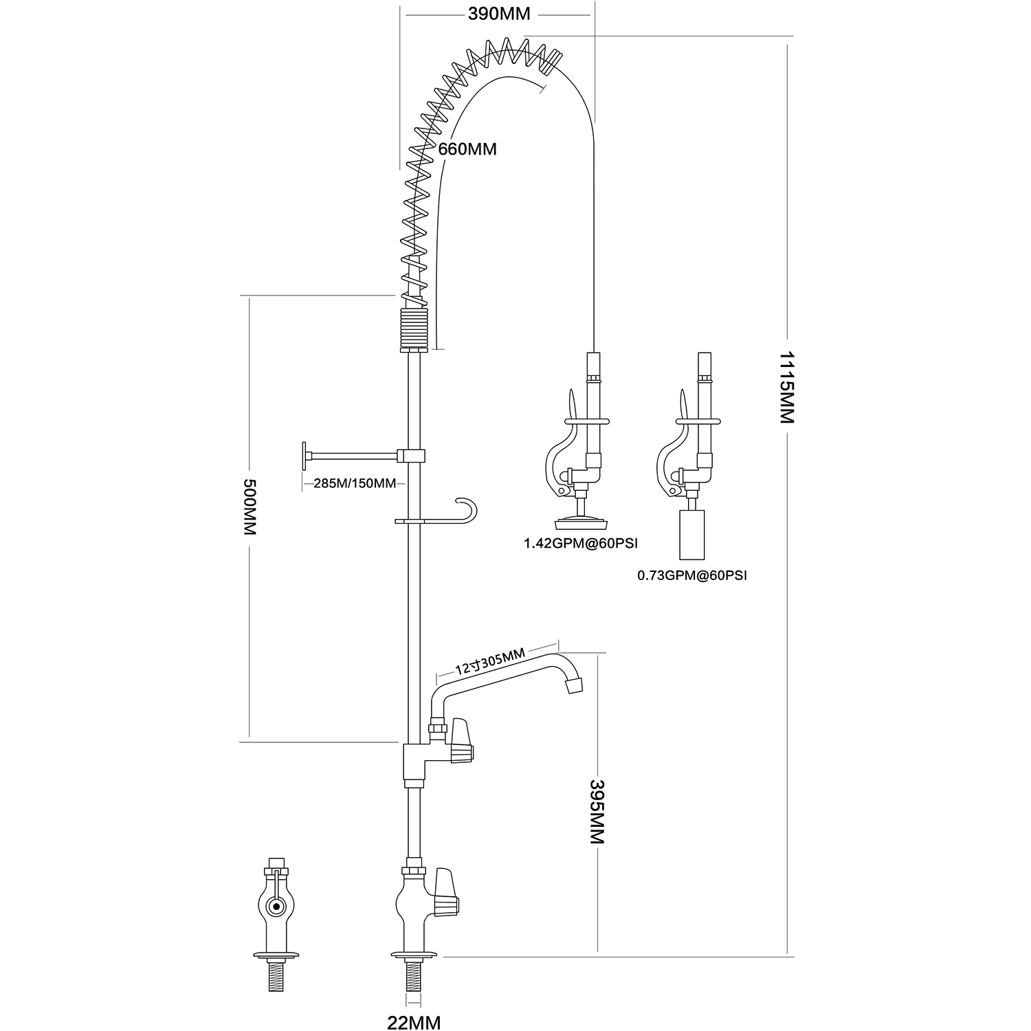 Iepriekšējas skalošanas izsmidzinātājs ar grozāmu jaucējkrānu Darbvirsmas montāža Viena ieeja Augstums 1000 mm Nerūsējošais tērauds | Adexa EQ2803A12