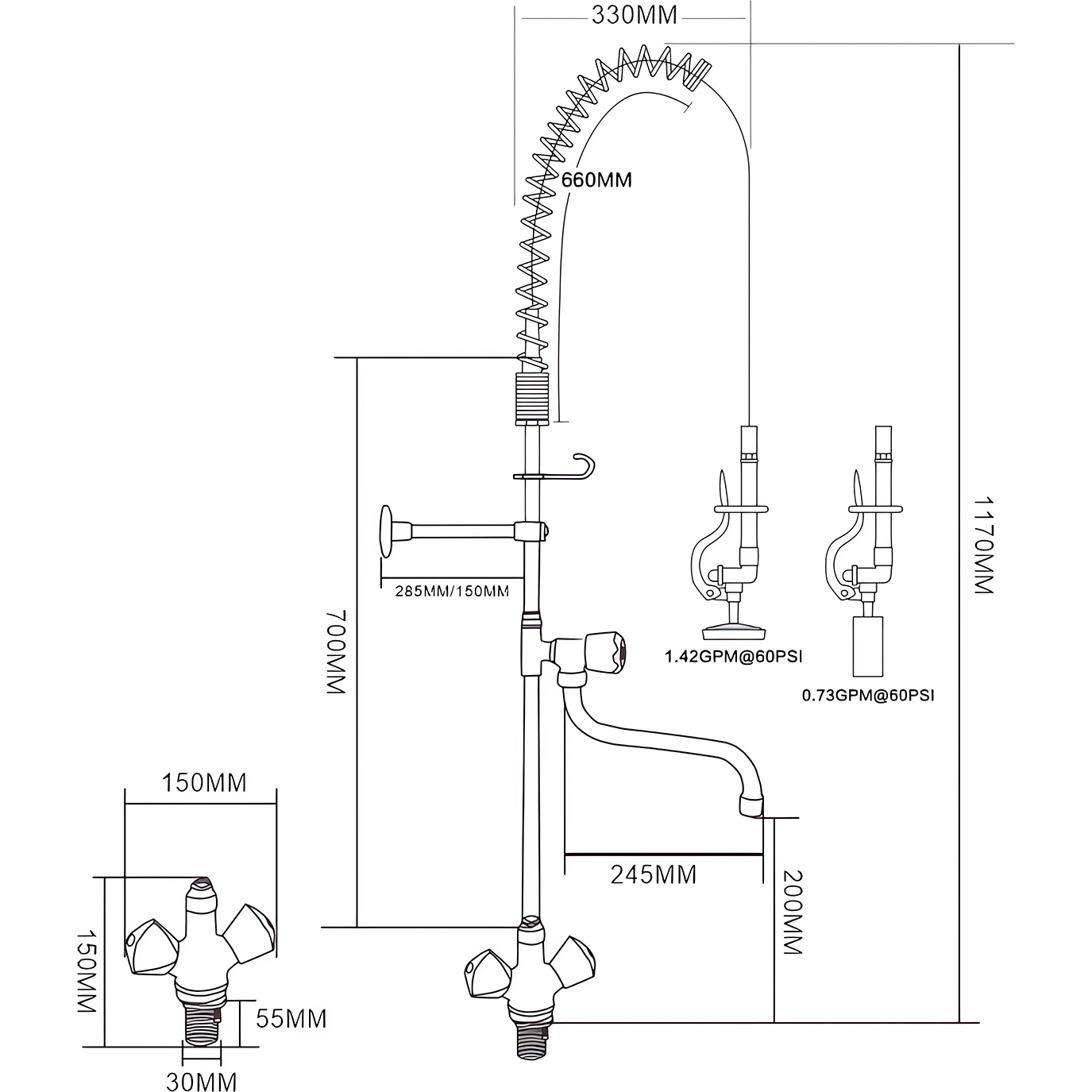 Iepriekšējas skalošanas smidzināšanas sistēma ar jaucējkrāna stiprinājumu klāja montāža Pagriežams rokturis Viena cauruma Dubultā savienojuma Augstums 1170mm Caurums 30mm Nerūsējošais tērauds | Adexa 6902A12