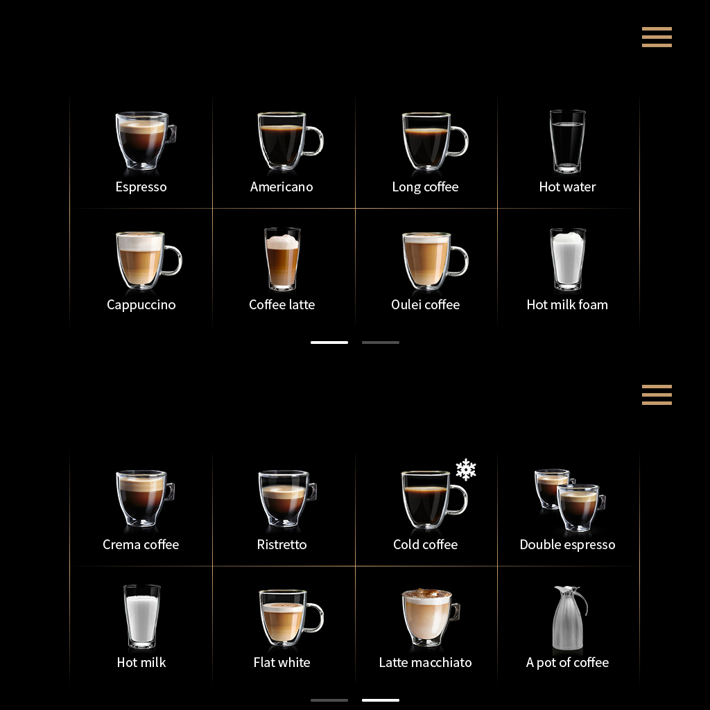 16 (Espresso, Americano, Garā kafija, Karsts ūdens, Kapučīno, Kafijas latti, Oulei kafija, Karsta piena putas, Krēma kafija, Ristretto, Aukstā kafija, Dubultais espresso, Karsts piens, Plakanā baltā, Latte macchiato, Kafijas kanna)