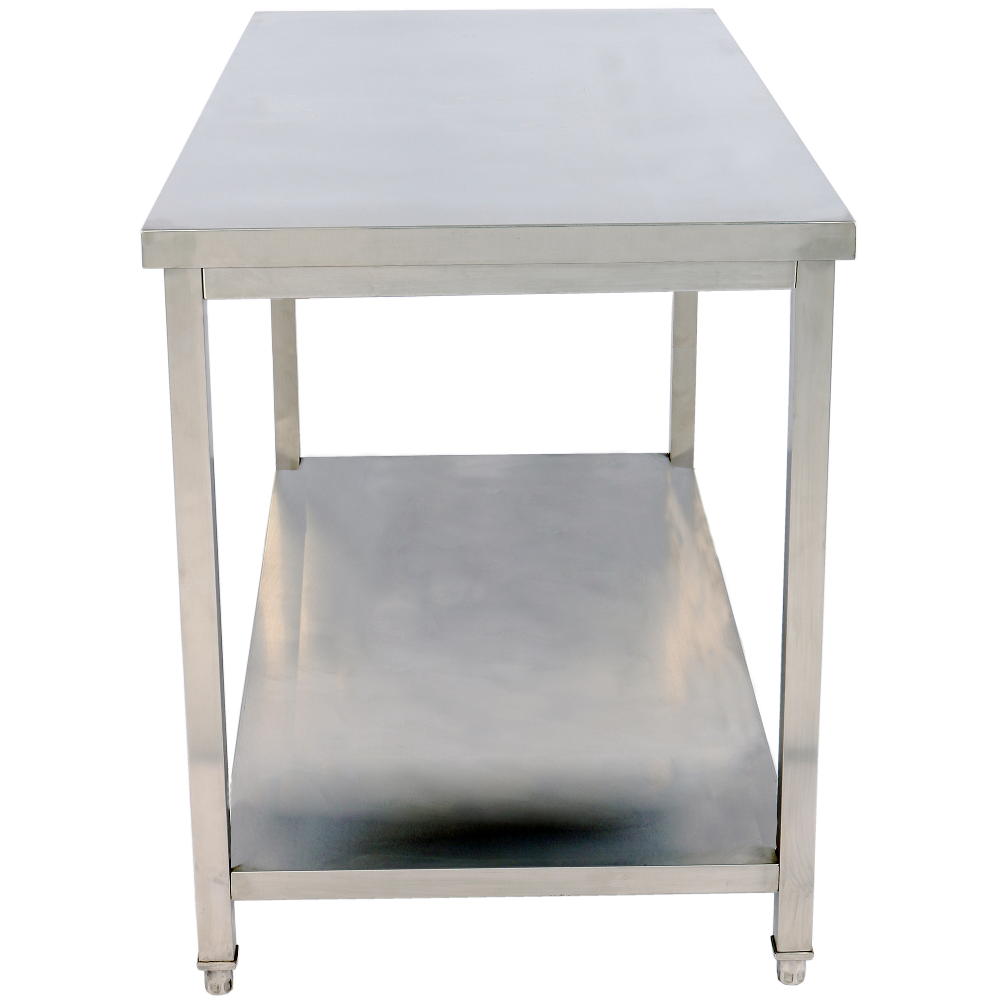 Original price was: 318,96 €.194,57 €Current price is: 194,57 €. (ei sis. KM) Šis ir lielisks cenas un kvalitātes attiecības komerciālais darba galds. Smaga slodze, augstākās kvalitātes, 201 AISI nerūsējošā tērauda galds, kas atbilst pārtikas pakalpojumu un ēdināšanas nozares augstajiem kvalitātes standartiem. Apakšējais panelis un uzlocītas malas papildu aizsardzībai. Atbilst starptautiskajiem higiēnas un tīrības standartiem. Konstrukcija no nerūsējošā tērauda ar Scotch Brite apdari, lai atbilstu augstākajiem higiēnas standartiem. Pastiprināts virsmas galds ar dubultsienu nerūsējošo tēraudu. Nestspēja līdz 500 kg. Ļoti augsta nestspēja. Lūdzu, skatiet sadaļu “Specifikācija” sīkākai informācijai. Ir noliktavā