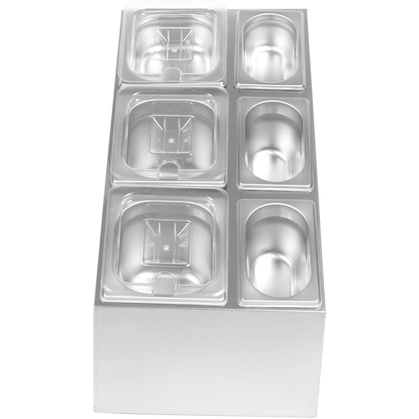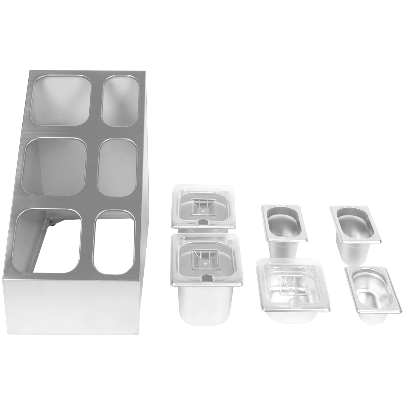 Komerciālais garšvielu katliņu turētājs, ieskaitot 3xGN1/6 + 3xGN1/9 katlus ar iedobuma vākiem un kausiņiem | Adexa CHM01D