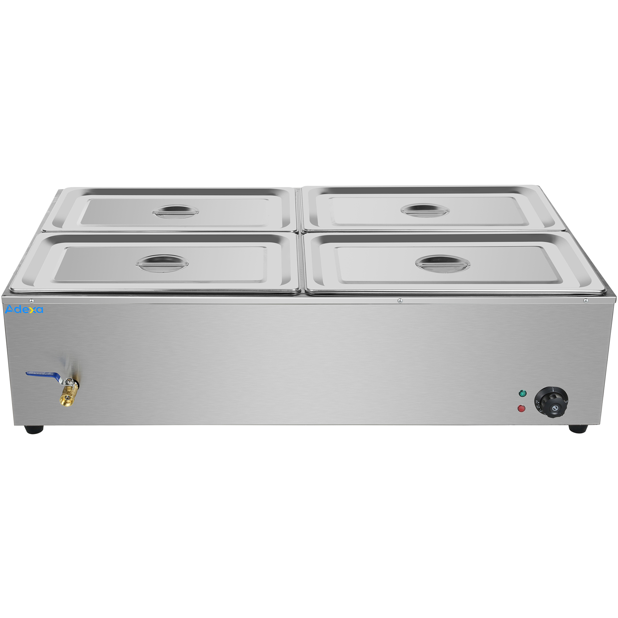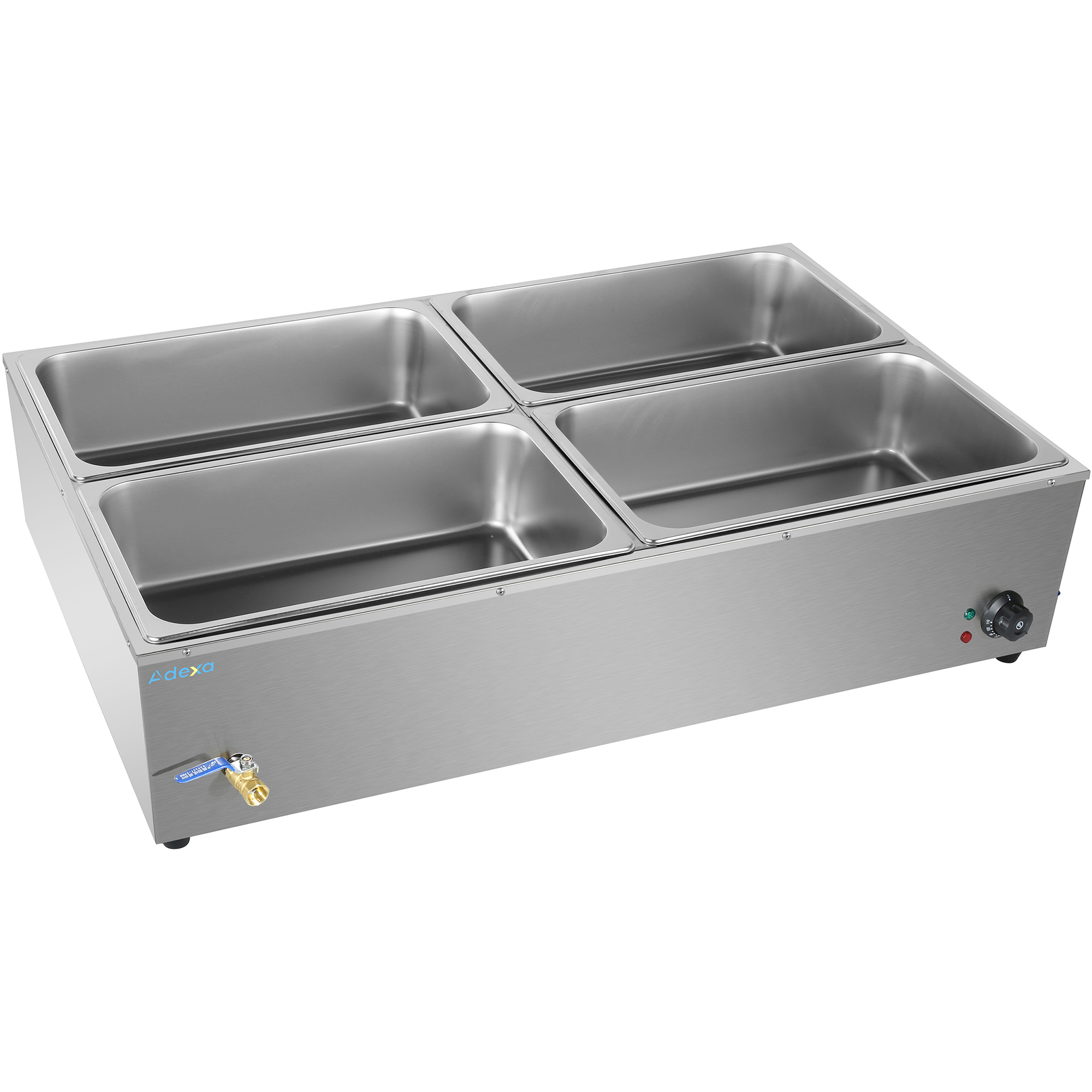 Komerciālais XL Bain Marie ar drenāžas krānu 4xGN1/1, ieskaitot 4 konteinerus ar vāku | Adexa HB4XL