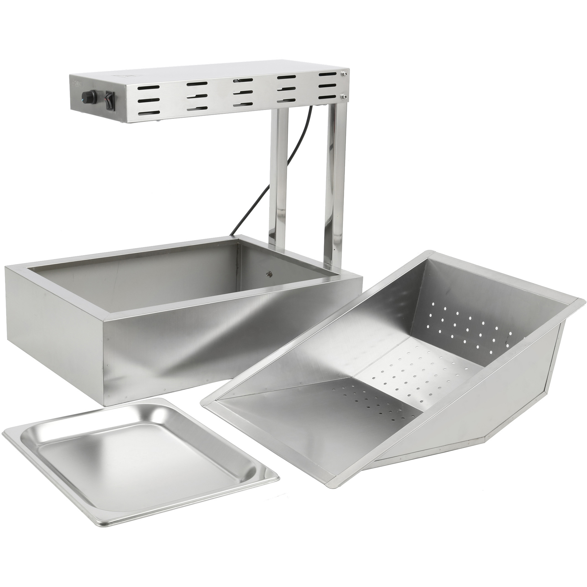 Original price was: 258,89 €.126,86 €Current price is: 126,86 €. (ei sis. KM) Izgatavots no izturīgas nerūsējošā tērauda un alumīnija konstrukcijas, lai nodrošinātu vienkāršu kopšanu un tīrīšanu, šis vienkārši izstrādātais pārtikas sildītājs ir ideāls papildinājums jūsu mazam vai vidējam kafejnīcam, restorānam vai bufetei. Saglabājiet savus populārākos ēdienus drošā un higiēniskā temperatūrā (bez ūdens zudumiem) ar šo vietu taupošo galda ierīci. Apkures caurules nodrošina ātru un vienmērīgu sildīšanu visā servisā, un gumijas kājas ar pret slīdēšanas funkciju novērš slīdēšanu uz darba virsmas. Visa konstrukcija no nerūsējošā tērauda nodrošina izturību un vieglu tīrīšanu. 600W infrasarkano staru apkures caurule, lai uzturētu frī karstu un kraukšķīgu. Ar bezgalīgo vadību jaudai un apkurei. Viegli lietojami gaismas un karstuma slēdži priekšpusē. Aprīkots ar kvarca lampu izgaismot izkraušanas zonu. Lielais perforētais grozs (izmērs 45x30x12cm) palīdz sakārtot pasniegšanu aizņemtajos laikos. Ar nerūsējošā tērauda eļļas savākšanas tvertni. Viegli tīrāmi un pārstrādājami. Detalizētu informāciju skatīt sadaļā “Specifikācijas”. Ir noliktavā