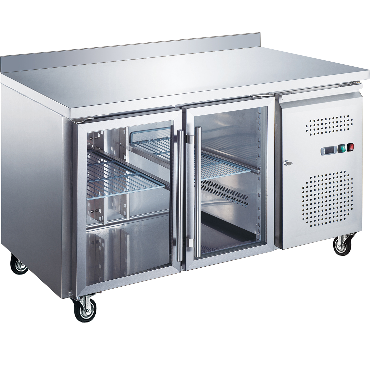 Nerūsējošā tērauda saldēšanas lete ar 2 pašslēdzošām stikla durvīm. Tā ir aprīkota ar iekšējo apgaismojumu un riteņiem. Temperatūras diapazons ir no +2 līdz +8°C. Digitālā temperatūras kontrole, ventilētā dzesēšana un automātiska atkausēšana ir standarta funkcijas, kas padara šo iekārtu lielisku papildinājumu jebkurai komercveida virtuvei. 2 pašslēdzošas stikla durvis +2 līdz +8°C 282 litri Nerūsējošais tērauds 1360x600x850mm 275W Ventilēta dzesēšana ar automātisko atkausēšanu Lūdzu, skatiet sadaļu ‘Specifikācija’ detalizētai informācijai. Ir noliktavā