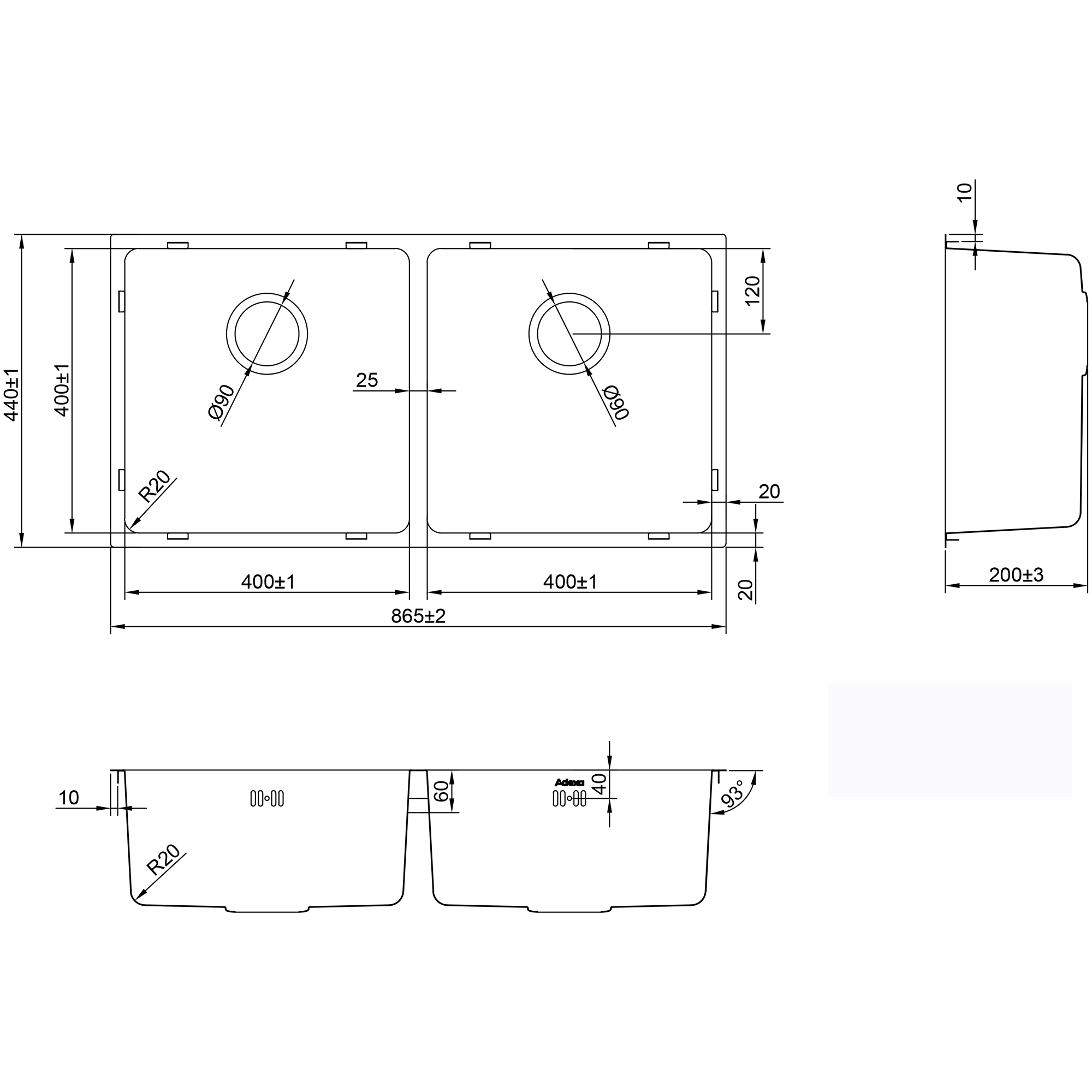 Roku darināta ieliekama dubultā izlietne 865x430x200mm nerūsējošs tērauds R20 virsmā montējama / apakšējā montāža | Adexa 204040D